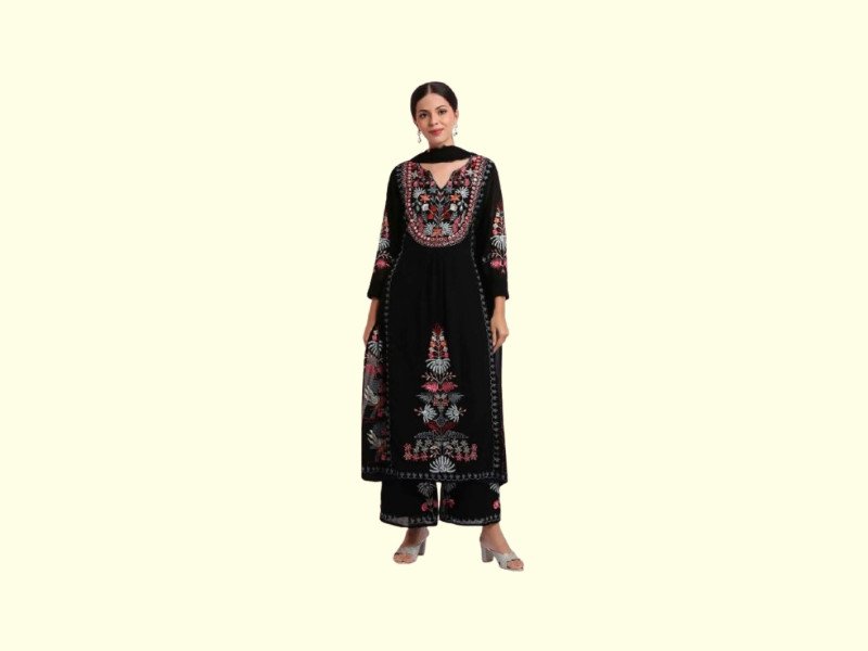 - Fabric & Design: Features a premium georgette Kurti with detailed embroidery or sequin accents on the neck and sleeves for a touch of festive allure.