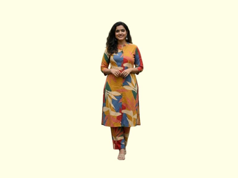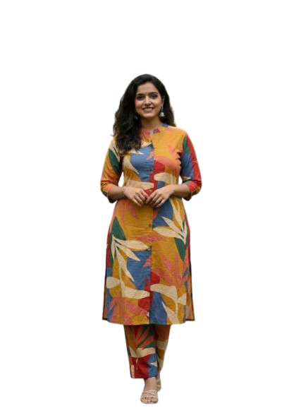 2 Piece multi color Kurti featuring a captivating abstract or floral print in a striking mix of colors including mustard, blue, and red. Crafted from soft and breathable rayon or cotton blend fabric, this set offers both elegance and ease of wear for any casual or festive occasion.
